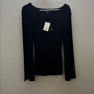 Chic black long sleeve top. Features ribbed texture and button details on sleeves. Ideal for versatile styling.