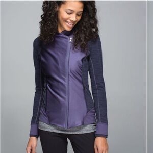 Lululemon athletica Renewed Jacket Purple Herringbone Full Zip, size 4. Nightfall / Diamond Jacquard Space Dye Black Nightfall. Long sleeves, lots of pockets, thumb holes