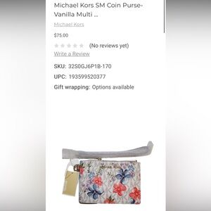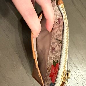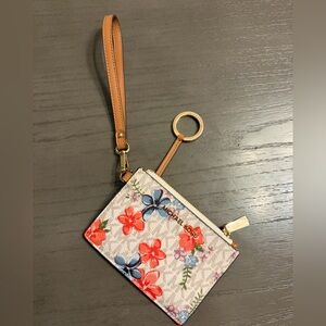 Super cute and never used Michael Kors coin purse with card slots and wristlet! Classic white MK print with flowers. It has three card slots and a zip pouch for keys and change. Carry this compact style by the wristlet strap or throw it into your tote. Also has a ring that you can use to attach it to your key lanyard or outside of your bag. I purchased a while ago and never used it but need to downsize. From my smoke free and pet free home! Details: