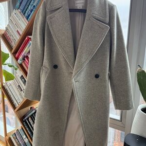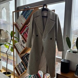 Fits like a 0. Elegant gray coat. Features double-breasted design. Perfect for stylish layering.