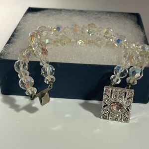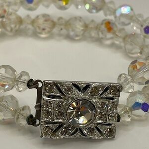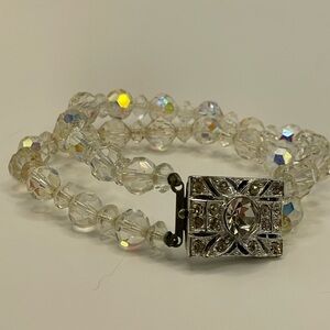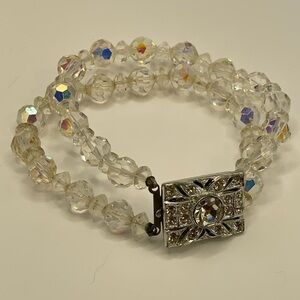 Timeless vintage sparkle alert! This elegant 7.25” bracelet features double strands of faceted clear crystal beads with stunning Aurora Borealis (AB) iridescence—those magical rainbow flashes dance in the light like northern lights captured on your wrist! 🌈💎