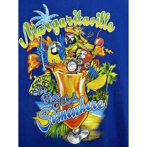 Jimmy Buffett Music Margaritaville Mens Blue Double Graphic T-Shirt 2XL Parrotheads Lightweight Breathable Stretch Relaxed Cotton. It's 5 O'Clock Somewhere Animal Print Cocktails Tropical Island. Great Pre-Owned Condition Gently Worn. Ships from smoke free home.