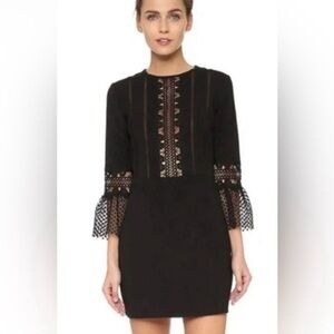 New with Tags! Self-Portrait Black Lace Insert Bell Sleeve Shift Dress. Size 10. Please see photos for measurements and material content.