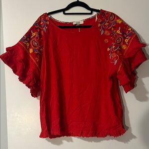 Gorgeous linen blend top with double ruffle sleeves. Raw hem gives a playful fringed finish to this amazing piece. Color is an orangey red. The sleeves have colorful embroidery on the front and back. Embroidered parts are lined with polyester.