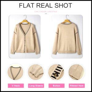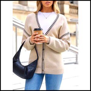 Oversized V-Neck Cardigan Sweater, Button Front, Striped Trim, Fall Winter