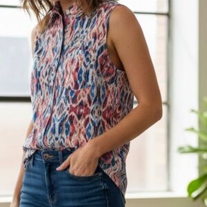pgrade your summer wardrobe with this vibrant St. John's Bay sleeveless blouse. Featuring a striking red and blue geometric print, it's perfect for layering under a cardigan for work or wearing alone on a sunny day.