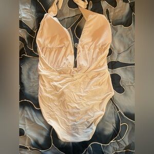 Elegant cream one piece with halter neck. Deep V-neckline. Perfect for beach or pool.