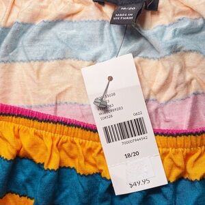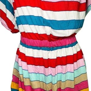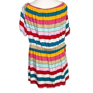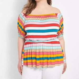 This everyday top shows off a whimsical off-the-shoulder neckline, always-pretty puff sleeves and a flattering peplum hem in a colorful striped print. Wear it four ways: on the shoulders, off the shoulders, one shoulder or completely strapless.