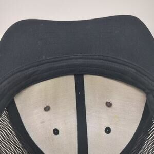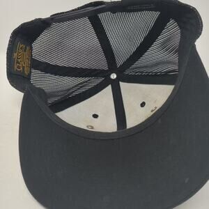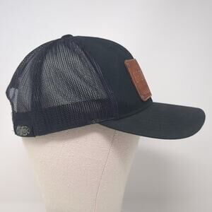 Yupoong Trucker Hat Black Brown Leather Patch Broken Bowl Catering OS Snapback