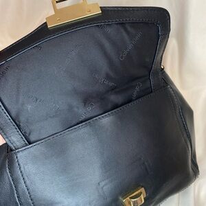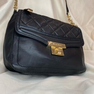 Features a quilted flap design, gold-tone hardware, and signature Calvin Klein logo lock.