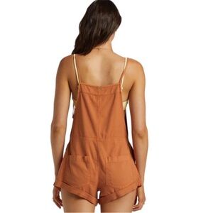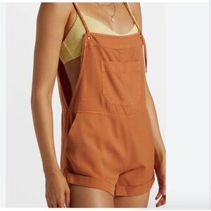 Trendy tan overalls with adjustable straps. Perfect for casual outings.