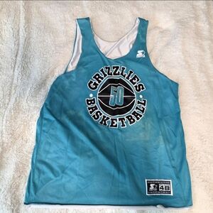 Vintage Starter Vancouver Grizzlies reversible basketball jersey from the iconic 1990s teal era. Features authentic mesh construction, bold Grizzlies Basketball graphic, Starter branding, and original size 48 tag. Reversible design with teal and white sides, making it a versatile throwback piece for NBA fans, collectors, or streetwear styling.