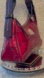 Chic and stylish croc-embossed design. Rich deep red hue. Perfect for any occasion. It has a blue duck bag charm. All metal is silver-tone. The interior is light beige with a coated canvas texture and very clean. There is 1 zipper pocket and 1 small slip pocket. The strap and piping trim is dark brown. There is very very minimal rubbing on 2 corners of the bag.