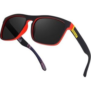 Sporty style men's polarized sunglasses featuring a black frame with striking red accents. These sunglasses offer UV protection and a comfortable wrap-around design. The arms feature a unique graphic print for a touch of personality. Perfect for driving, outdoor activities, or everyday wear.