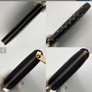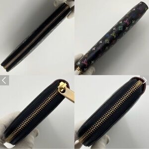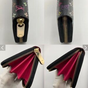 Authentic Louis Vuitton wallet featuring vibrant multicolor monogram on black leather. Pink leather interior, Gold-tone hardware zip around long wallet