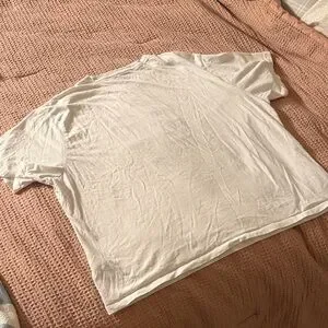 White t-shirt featuring colorful sardine can graphics. Unique and artistic design. Small hole shown!