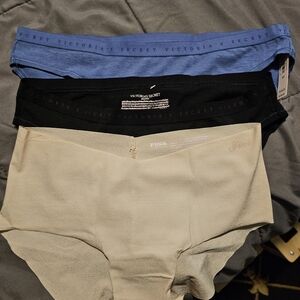 Victoria's Secret beige hip hugger panties in tan. Comfortable and stylish. and you will also get 2 cotton bikini style panties size S as well. 3 pairs total. I took tags off 2 panties. the tag is still left on one pair. I bought the wrong size and too late to return now.