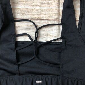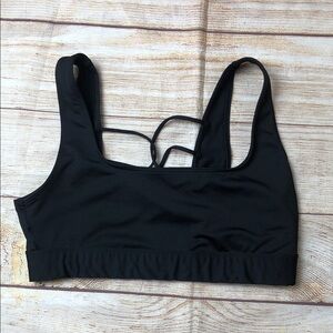 Stylish black sports bra with strappy back. Ideal for active wear.