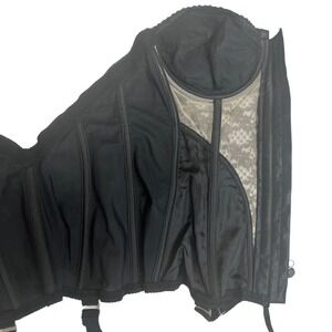 A vintage black lace and satin corset bustier with adjustable garter straps. This elegant piece features a front zipper closure and intricate lace detailing on the bust. Perfect for special occasions, a boudoir photoshoot, or adding a touch of allure to your lingerie collection.