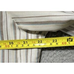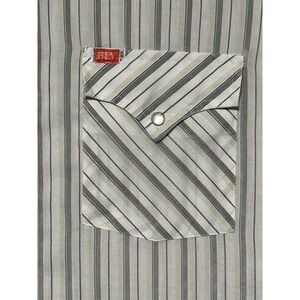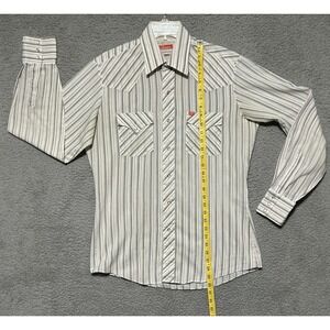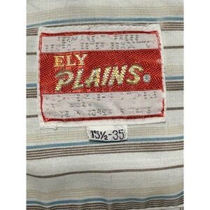 This Vintage Ely Plains Shirt is a classic piece of men's clothing with a Western cowboy theme, perfect for casual, travel, or workwear occasions. The shirt features a collared neckline with a pearl snap closure, long sleeves, and a striped pattern. Made from a blend of polyester and cotton, this woven shirt has a chest size of 44 inches and comes in size L with a regular fit. It also includes pockets and is machine washable for easy care. The timeless design and high-quality fabric make this shirt a stylish and versatile addition to any wardrobe.