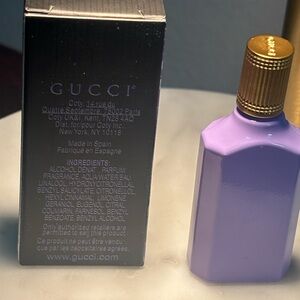 Elegant purple bottle with gold cap. Floral design on packaging. Gucci Flora branding.