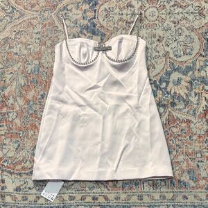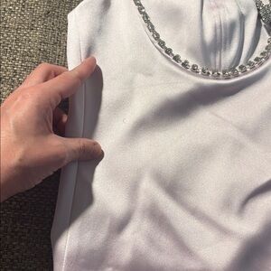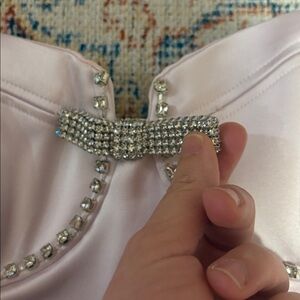 Self Portrait Pink Satin Diamanté Mini Dress size U.S. 6. This dress is new with tags but it does have two things to call out. First, one edge of the bow has come unattached, so you’d need to tack that back. Additionally, there is a run going down one side. Price reflects. Otherwise new with tags and from a smoke-free home.