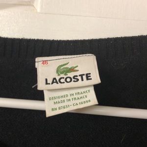 Classic black sweater. Features iconic white Lacoste logo. Comfortable and stylish.