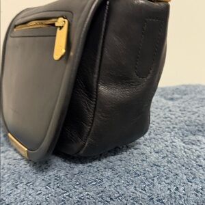 Elegant Coach crossbody bag in black. Features gold accents and a front zipper pocket. Perfect for everyday use.