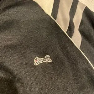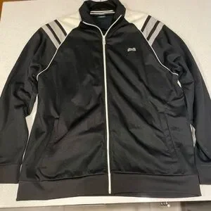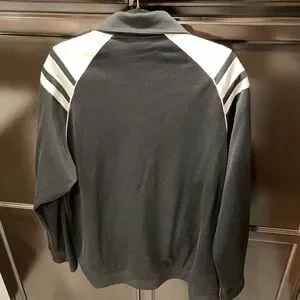 Chic track jacket with a black body and cream accents. Features a full zip and sporty stripes. Ideal for casual wear.