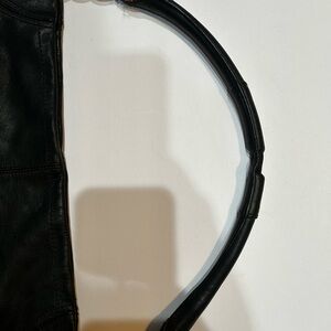 This black leather shoulder bag is perfect for any occasion. Featuring a sleek design with gold accents.