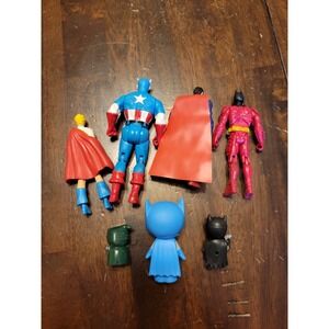 This LOT of 7 action figures includes popular superheroes such as Power Girl, Batman, Captain America, and Dr. Doom. Made of plastic and featuring adjustable details, these vintage figures are part of the Marvel Universe franchise. Produced by Hasbro in the 1990s-current time period, these unboxed action figures are a must-have for fans of superhero-themed toys and collectibles. The colorful designs and variety of characters make this set a valuable addition to any action figure collection.