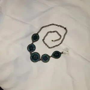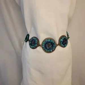 Stylish bronze chain belt featuring torquoise blue and royal blue stone details to add a chic touch to any outfit.