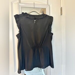 Excellent, like new. Elegant black top with ruffle details. Sleeveless design. Perfect for any occasion.