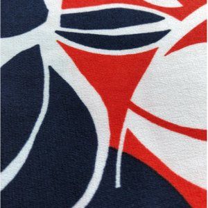 - Orangish red background with navy blue and white abstract floral pattern