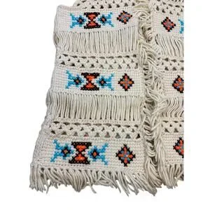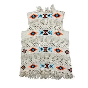 Step back in time with this amazing vintage 1960's handmade floral crochet vest! Perfect for adding a touch of hippie boho chic to any outfit. This fringed beauty is ideal for festivals, concerts, or just expressing your unique style. The aztec pattern adds a unique flair.