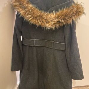 Elevate your wardrobe with this chic gray coat, featuring luxurious faux fur trim for added elegance. Perfect for any stylish outing.