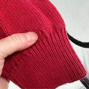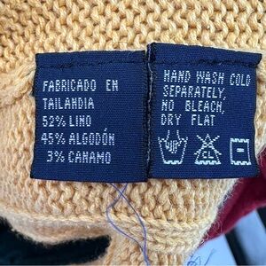 Bold colorblock design with cable knit texture. Features red, yellow, cream, navy, and green panels. Cotton, linen, hemp blend. This sweater just feels amazing and is so well made! It does have a very small hole left sleeve near the cuff. See photos!