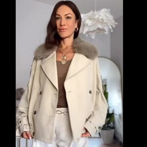 Trench coat with a lapel collar and detachable faux fur collar. Long sleeves with tabs. Front pockets. Elastic hem. Double-breasted button fastening at the front.