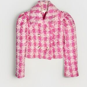 Loveshackfancy Tweed Wool Cropped Double-Breasted Jacket Plaid Pink - Women's size 0/XS