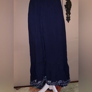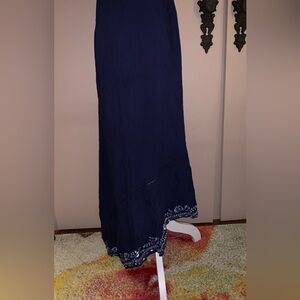 Chic dark blue maxi skirt with delicate embroidered light blue flowers surrounding the entire bottom of the skirt. Featuring a drawstring waist with a high low hemline. Perfect for casual or dressy occasions. NWOT