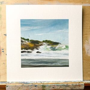Title: "York, Maine" - This original oil painting captures the classic New England coastal feel of summer in York. The ocean waves crash against rocks in the distance and mellow to shallow waves washing over the beach. Blue sky and clouds mingle over buildings and a flagpole, capturing the beauty unique to this town in Maine.