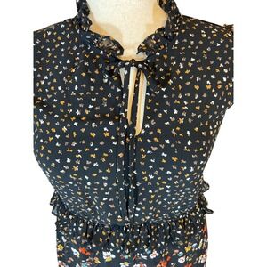 Floral Boho Dress Ruffle Neck Keyhole Tie Midi Dress Fairy Size L Black