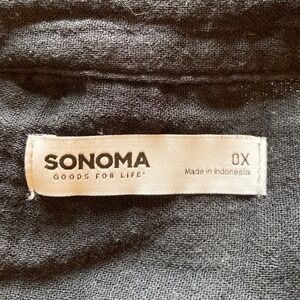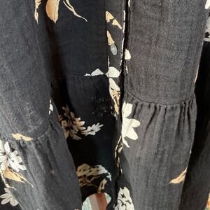 SONOMA Tiered Maxi Dress Black floral Boho 100% Cotton. This dress features a V-neckline with a button-front closure and short puff sleeves. The empire waist cinches the silhouette, leading to a tiered skirt that adds flow and movement. The fabric has a crinkled coton texture lending a relaxed feel to the design.