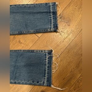 Women’s Free People stylish straight leg blue jeans with raw hem. Versatile and comfortable. Ideal for everyday wear.