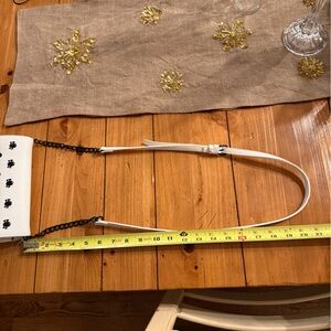 Style: Crossbody with an adjustable strap, featuring both a white portion and a black chain detailing