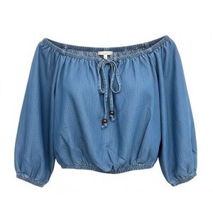 Step out in style with this elegant off-shoulder denim blue blouse. Perfect for any occasion.