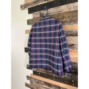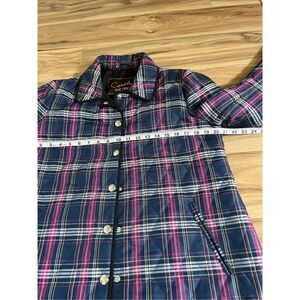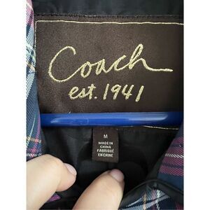 Coach Quilted Navy Blue & Purple Plaid Print Long Sleeve Snap Front Jacket Sz M See pictures with measurements. Gently used preowned condition. Color maybe slightly different due to light