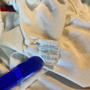 Channel a playful retro vibe with this Brandy Melville graphic tee. The crisp white cotton forms a perfect canvas for the bold red and blue horizontal stripe across the chest, adding a pop of sporty color. This classic crewneck tee is designed for everyday comfort and effortless style. Perfect for casual outings, weekend adventures, or layering under your favorite jacket.
