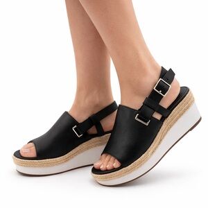 Step into effortless style with these chic black espadrille wedge sandals. Designed with a sleek pebbled upper and an adjustable slingback buckle, these sandals offer both comfort and a secure fit. The platform wedge sole features classic braided jute detailing paired with a lightweight base, giving you height without sacrificing all-day wearability.