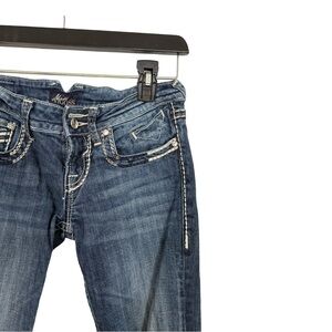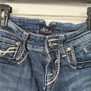 Vigoss bootcut jeans featuring classic medium-wash denim with heavy contrast stitching and signature embroidered back pockets. Flattering mid-rise fit with a slight bootcut leg, perfect for everyday wear or dressing up with boots or heels.